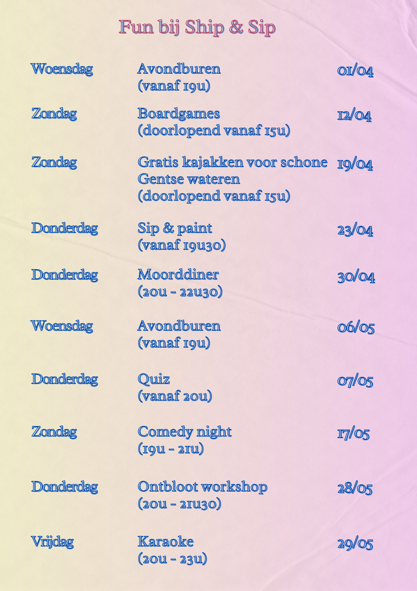 Meer info per event vind je op onze Facebook pagina.